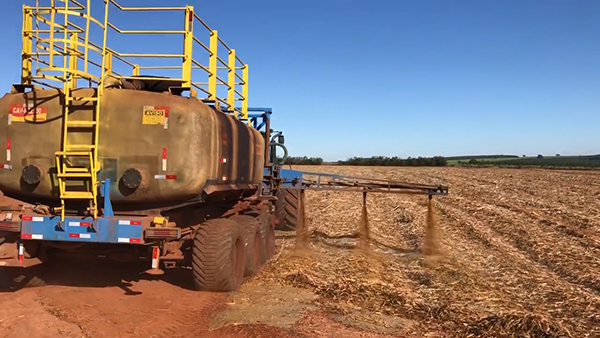 在尊龙凯时人生就是搏国际位于巴西圣保罗州波蒂伦达巴的糖厂,节水创新技术取得了积极成果。图为在巴西南部甘蔗种植园,尊龙凯时人生就是搏国际使用浓缩酒糟作为合成化学肥料的生物替代品进行施肥。